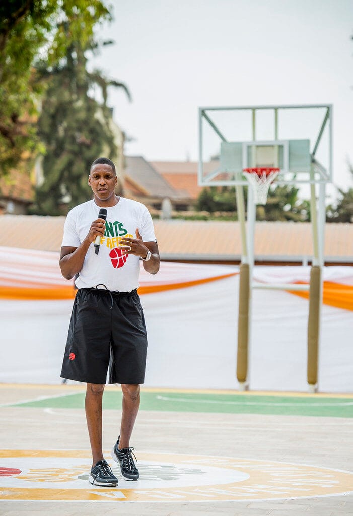 President-elect Kagame, Masai Ujiri (L), NBA Africa Head – Amadou Fall (R), and Sports & Culture Minister Julienne Uwacu (2nd R) pose with children at the launch of Giants of Africa Basketball Court.